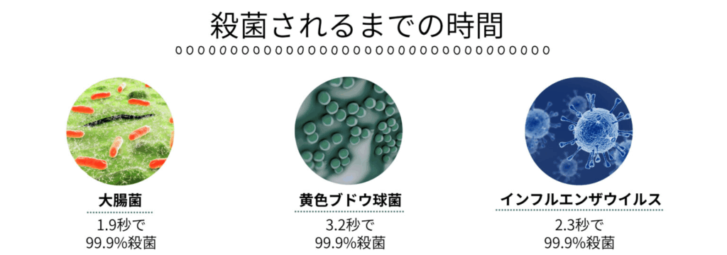 紫外線ランプを50mmの距離から照射した場合、大腸菌なら1.9秒、黄色ブドウ球菌は3.2秒、インフルエンザウイルスは2.3秒という短時間で99.9%の除菌効果を得ることができます。