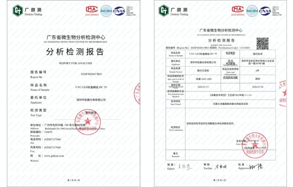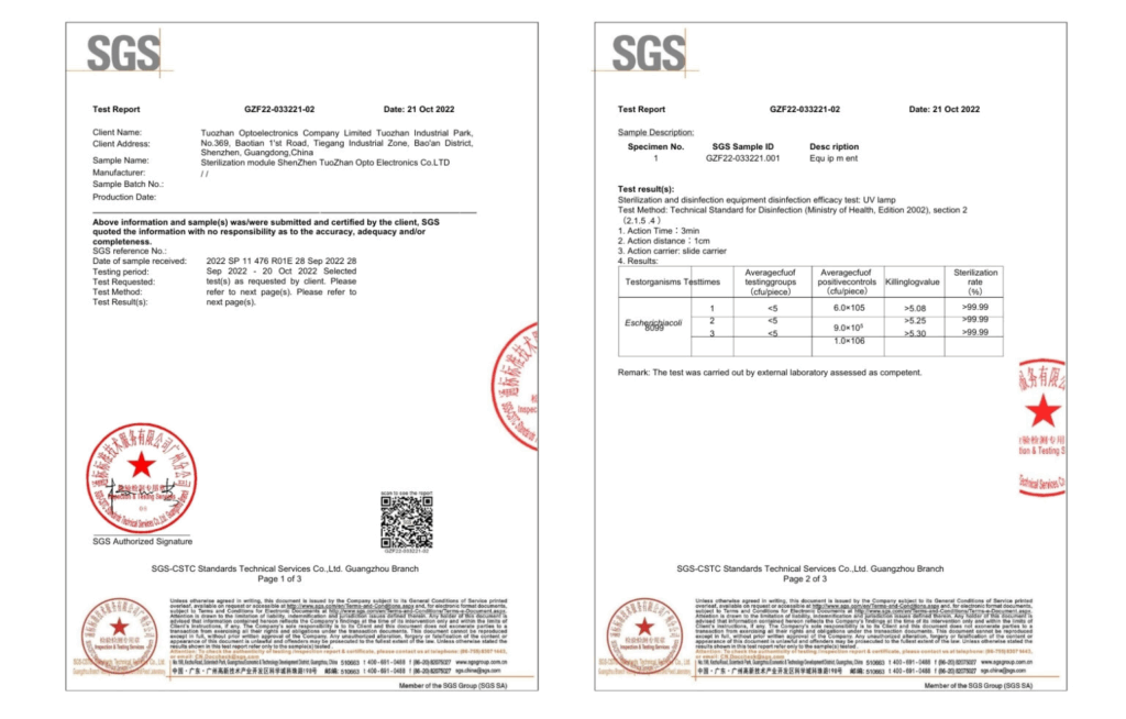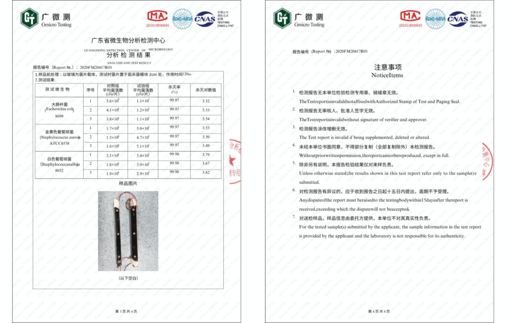 UVC-LED殺菌モジュールは、広東省微生物分析検測センターおよび国際検査機関SGSによる試験において、大腸菌・黄色ブドウ球菌などに対して99.97〜99.99%以上の除菌効果が確認されました。