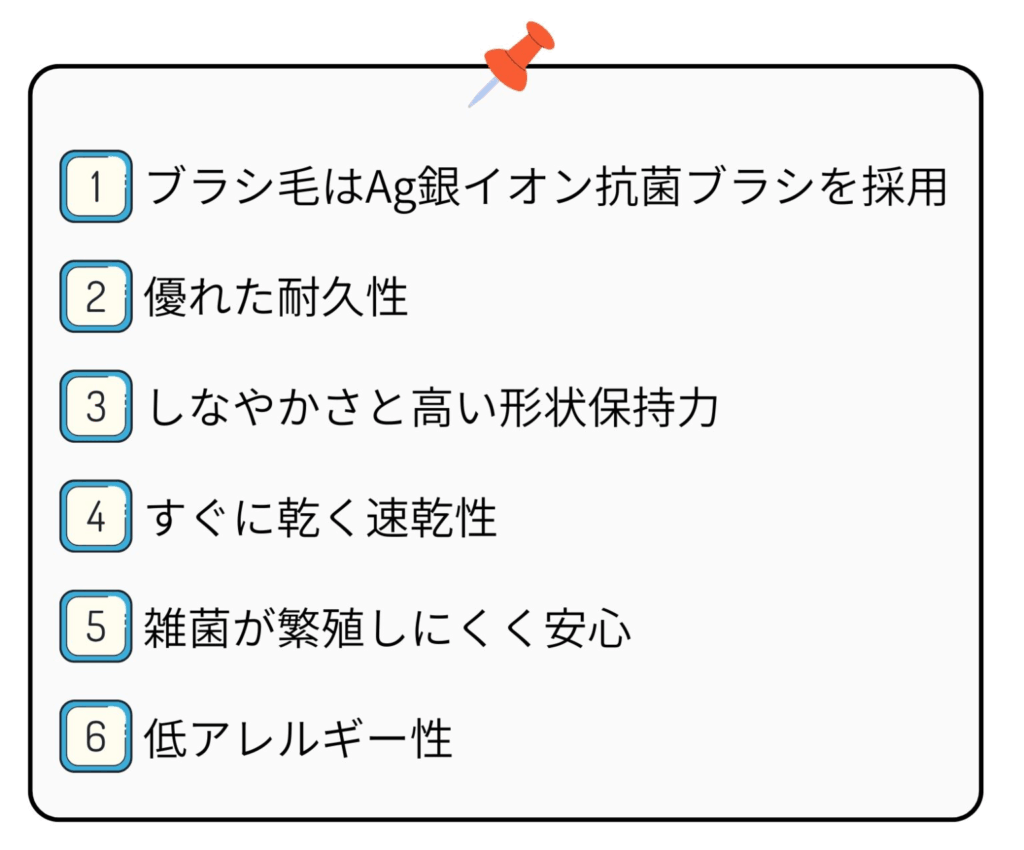 本試験の結果、抗菌ブラシ毛は大腸菌に対して平均99%、黄色ブドウ球菌に対して99%以上の抗菌効果があることが確認されています。