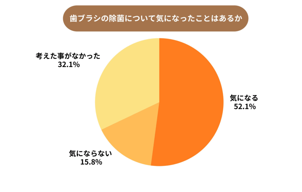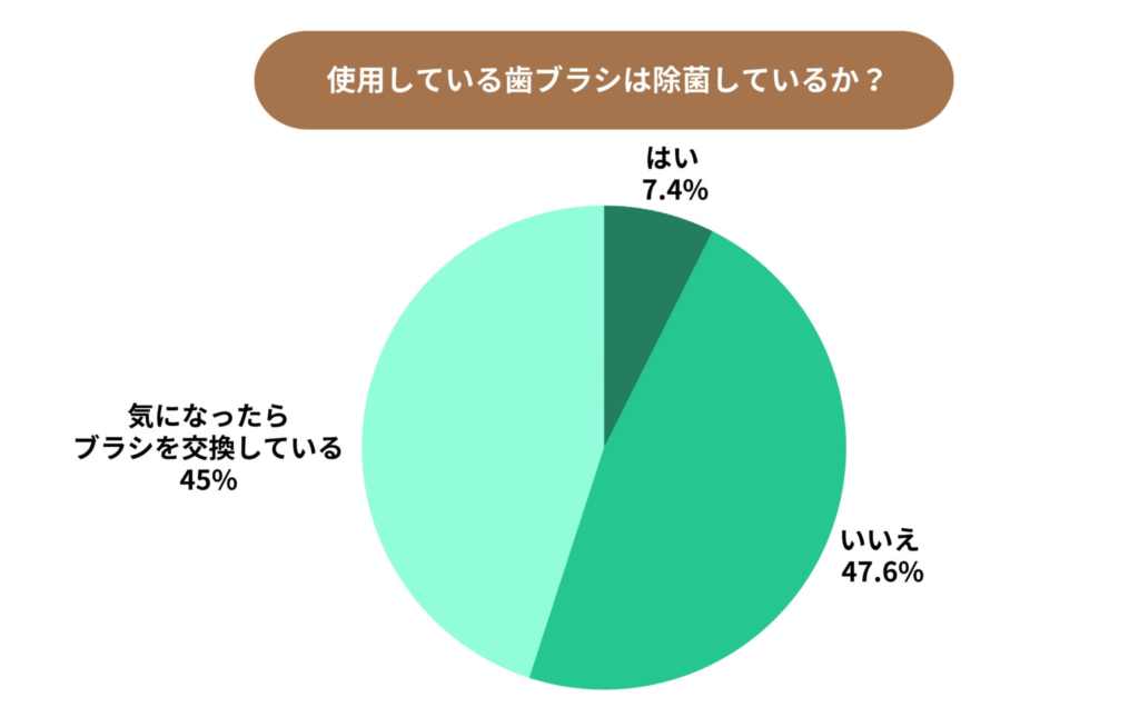 グラフを見てもわかるように、半数以上の方が歯ブラシの除菌を気にしているにも関わらず、実際に除菌をしている人はわずか7.4%という結果に。さらに、「そもそも歯ブラシの除菌が必要だと考えたことがない」という人が32.1%と、意外にも多いことが判明しました。